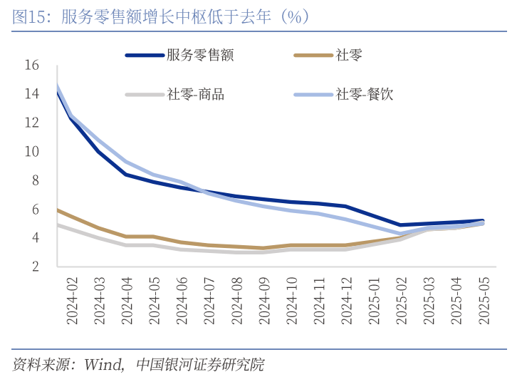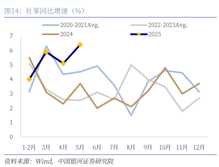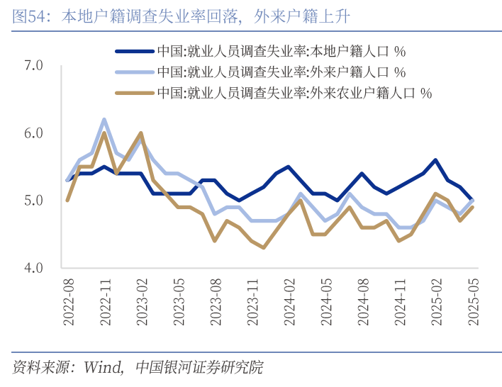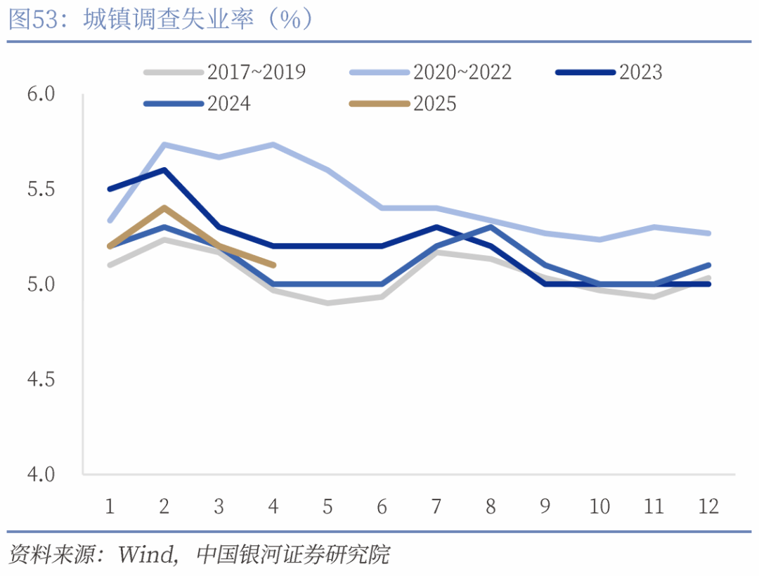 上半年赋闲率数据反映就业压力有所加大。1-5月,城镇查询拜访赋闲率为5。0%,取客岁持平,然而1-4月均较客岁有所提高。特别是5月外来户籍生齿和外来农村生齿赋闲率均有所添加,别离涨0。2pct至5。0%和4。9%。我们认为最次要的要素就是5月出口和内需方面的波动让出产程度下降,因而降低了3-4月抢出口和抢“两新”带来的冲击式用工需求。同时3月赋闲安全基金收入累计同比上涨22。4%,目前就业压力较大。估计全年城镇查询拜访赋闲率中枢正在5。2%-5。3%摆布,较客岁小幅抬升。次要要素有:一是下半年出口的潜正在压力削减外向型就业需求;二是1222万立异高的高校结业生,叠加2023年离校未就业结业生即将得到应届生身份、以及2024年离校未就业结业生配合挑和就业市场;三是若下半年以旧换新政策力度和结果均边际下滑的环境下,企业的出产预期也将下调,压缩用工需求。就业是平易近生之本,4月局会议将稳就业摆正在“四稳”首位,就业政策估计会进一步加力。4月局会议提到要“出力稳就业、稳企业、稳市场、稳预期”。6月9日,中办、国办发布《关于进一步保障和改善平易近生 出力处理群众急难愁盼的看法》,提到“继续将技术提拔补助申领对象放宽至领取赋闲安全金人员。”“加大以工代赈实施力度,优先吸纳带动低收入生齿当场就近就业增收。”6月10日,财务部相关担任人引见,2025年,地方财务放置就业补帮资金667。4亿元,支撑处所落实就业创业搀扶政策。延续降低赋闲、工伤安全费率,继续实施赋闲安全稳岗返还、就业见习补助提前发放等政策,支撑企业纾解坚苦、不变岗亭。实施一次性扩岗补帮政策,并将实施范畴扩大至社会组织,支撑吸纳高校结业生等青年群体就业;加强残疾人、零就业家庭等坚苦群体就业帮扶,推进沉点群体就业。继续放宽技术提拔补助申领前提,支撑高质量开展职业技术培训。