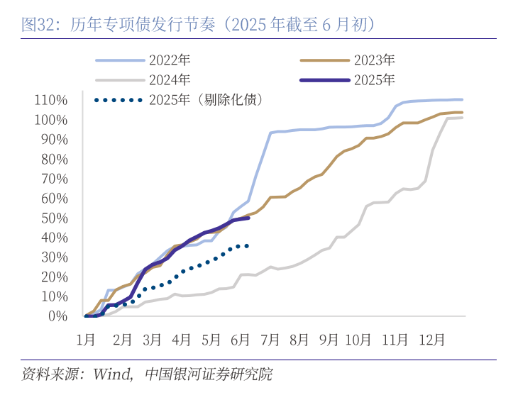 处所化债仍正在进行时,处所从导的基建或继续偏弱。本年债权刊行前置,但剔除化债要素后,专项债对经济的现实支持感化不及2022、2023年,对应处所从导的基建投资偏弱。从全年财务预算内资金和债权刊行节拍来看,本年债券刊行前置,二、三季度将是债权刊行高峰。截止2025年6月7日,处所专项债(含化债2万亿)刊行进度已达49。4%,新增特殊再融资债277亿,新增专项债(不含化债)刊行进度35。6%,处所一般债刊行进度59%通俗国债刊行进度39。3%。剔除化债资金后,本年专项债刊行进度远不及2022、2023年同期,对实体经济的资金投入力度无限,处所从导的基建投资增速持续偏低。