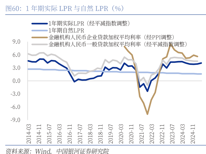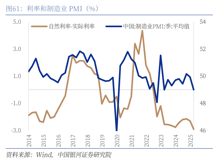 察看汗青数据,天然利率减去现实利率差值取中国制制业PMI有比力较着的正相关。我们测算的截至2025年一季度末,1年期现实LPR(经P平减指数调整)为3。89%,高于天然利率约230BP(我们测算1年期天然LPR程度为1。59%)。当前的现实利率仍然显著高于天然利率,仍需进一步伐降。
