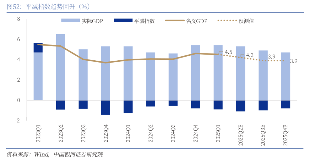 平减指数方面,平减指数连结平稳,表面P逐季平缓下行。连系我们对CPI和PPI的预测,我们认为P平减指数将连结平稳走势,Q2-Q4别离为-1。1%、-1%和-0。8%,全年平减指数为-1%。因为全年物价一直连结低位平稳运转,表面P和现实P之间的难以。我们估计2025年表面P增速为4。1%,Q2-Q4别离为4。2%、3。9%和3。9%,呈现平缓下行的趋向,年内经济体感仍偏冷。