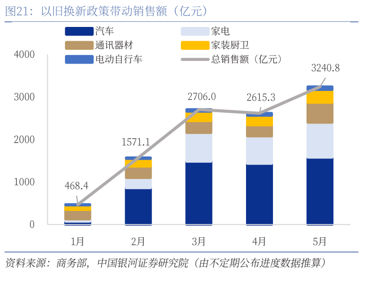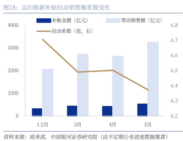 将来消费活力可否进一步或超预期仍取决于消费政策加力扩围的环境,而现有政策结果正正在逐渐退坡。本年以来的消费表示充实申明了我国消费市场具有强大的韧性取潜力,将来消费活力的进一步或仍取决于消费刺激政策的加力扩围。汗青经验来看,耐用品消费补助乘数效应会边际递减,我们按照商务部不按期发布的以旧换新政策进度数据推算本年各月各品类的财务补助利用额及拉动的发卖额,推算成果显示,本年1-2月、3月、4月、5月,以旧换新补助对发卖额的拉动系数别离为6。7、6。5、6。5、6。4。
