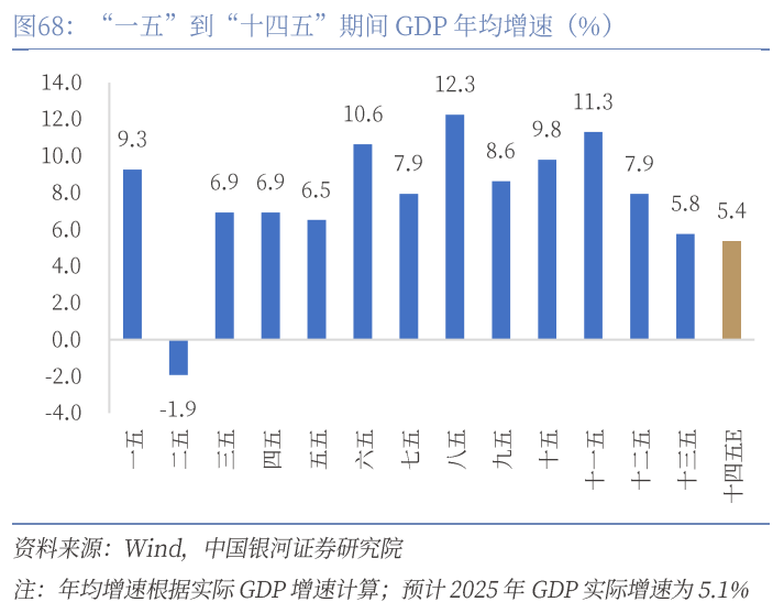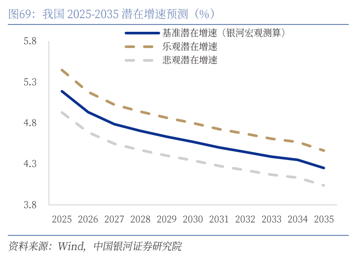 另一方面,“十五五”期间成长使命艰难。4月30日,总强调:“谋划“十五五”期间经济社会成长,必需精确把握“十五五”期间的阶段性要求,着眼强国扶植、平易近族回复伟业,紧紧环绕根基实现社会从义现代化方针。”“十二五”以来,多沉要素影响下,我国经济成长进入新常态,中国P增速不竭下行,经济增加向中速,P年均增速从“十一五”的11。3%降至“十四五”的5。4%。总正在关于《关于制定国平易近经济和社会成长第十四个五年规划和二〇三五年近景方针的》的申明中,明白提出到2035年实现经济总量某人均收入翻一番方针。按照我们的测算,要实现2035年P总量翻一番的方针,则2021-2035年P年均增速要达到4。7%。本年是“十四五”规划最初一年,我们估计2025年现实P增加5。1%,则2026-2035年(“十五五”“十六五”期间)人均P增速要达到4。4%。按照我们的测算,基给假设下,2026-2030年我国P年均潜正在增速为4。7%,2031-2035年P年均潜正在增速为4。4%。“十五五”期间是迈向2035年根基实现社会从义现代化承先启后的环节五年,正在表里部宏不雅发生较大布景下,我国面对的成长使命较大。需要以促成长,提高全要素出产力,处理持久内生增加动力不脚问题,提拔潜正在经济增速,帮力2035年近景方针成功实现。