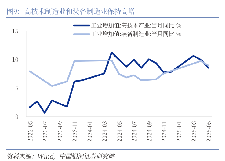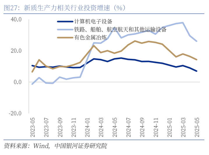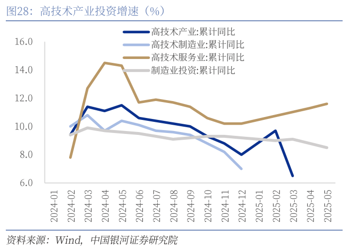 设备更新政策的持续发力正为制制业投资注入强劲动力。2024年4月七部分结合印发的《鞭策工业范畴设备更新实施方案》以来,设备工器具购买投资增速就成为持续拉动固定资产投资的范畴。2025年1-5月,设备工器具购买投资增速累计17。3%,远高于固定资产投资增速的3。7%和制制业投资增速的8。5%。汗青上我国履历了5轮完整的设备更新周期,每轮周期5-10年不等,目前正处于第六轮的向上阶段。按照过去两轮设备更新周期(2009-2015,2015-2023)来看,上行周期平均为35个月,而目前若是从数据上来看本轮上行周期持续了25个月。同时连系内需政策的迫切性以及以旧换新政策的加力扩围,我们认为下半年设备更新政策仍将拉动制制业投资。数字经济和人工智能的计谋投入将持续成为制制业投资的焦点驱动力之一。根本设备提拔、数据财产培育等列为八大步履沉点。方案提出,到2025岁尾,数字中国扶植取得主要进展,数字范畴新质出产力不竭强大,数字经济成长质量和效益大幅提拔,数字经济焦点财产添加值占国内出产总值比沉跨越10%,算力规模冲破300 EFLOPS,数据要素市场扶植稳步推进。我们认为这一政策框架从三方面间接拉动制制业投资:一是人工智能取场景融合驱脱手艺投资。《步履方案》要求“深度挖掘人工智能使用场景”,沉点成长智能网联新能源汽车、人工智能终端、智能机械人等智能制制配备,并扶植行业高质量数据集。按照《全国数据资本查询拜访演讲2024》,2024年我国开辟或使用AI的企业数量同比增加36%,全国算力总规模达到280EFLOPS,而工业范畴已建成3万余家智能工场,笼盖超80%制制业大类。将来算力方面政策指导下,企业为抢占手艺高地,将持续扩大对AI研发、算力规模、大模子摆设的投资。二是以“数据要素”为从线,扶植全国一体化数据市场。《步履方案》提出扶植全国一体化数据市场,鞭策公共数据“一本账”办理及数据财产集聚区结构。2024年全国数据买卖规模超1600亿元(同比增30%),而数据流动量每增10%可带动P增加0。2%。制制业做为沉点范畴,其数据资本开辟需求将催生新投资热点,例如深化“东数西算”工程将带动算力根本设备的投入,优化算力供需婚配。三是政策要求“夯实城市全域数字化转型底座”,完美物联网、工业互联网及5G工场扶植。截至2024年,我国累计建成5G基坐425。1万个,挪动物联网终端用户达26。56亿户,为制制业收集化升级奠基根本。《步履方案》进一步提出三年内“扶植200个高尺度数字园区”,并配套数字人才培育(如产教融合、手艺竞赛)和营商优化办法,指导本钱投向算力节点、工业互联网平台及低碳数字设备。新质出产力的成长继续带动制制业投资。3月,工做演讲摆设全年使命,提到要 “因地制宜成长新质出产力,加速扶植现代化财产系统。鞭策科技立异和财产立异融合成长,鼎力推进新型工业化,做大做强先辈制制业,积极成长示代办事业,推进新动能积厚成势、保守动能焕新升级。” 按照国度统计局数据,2025年一季度配备制制业添加值同比增加10。9%,比上年全年加速3。2个百分点;高手艺制制业添加值增加9。7%,加速0。8个百分点。估计下半年对新质出产力的投入还将持续,制制业高端化、智能化、绿色化将继续带动制制业投资。