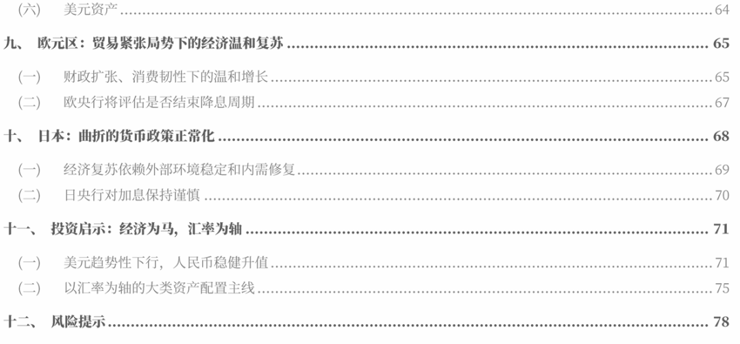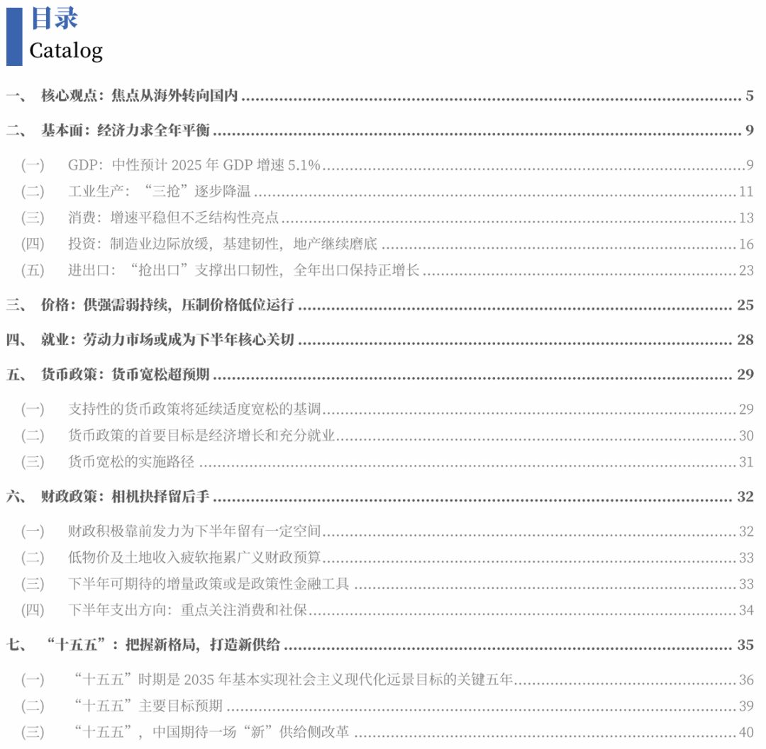 投资:经济为马,汇率为轴。从下半年总体款式来看,2025年根基面取2024年相仿,供需缺口未显著,政策同样连结“攻守兼备”态势,供给侧仍正在酝酿。然而,全球“抗差逻辑”下,中国经济相较美国更具韧性,国际出入均衡压力较2024年显著减轻,汇率由贬转升,汇率或从导下半年影响各大类资产的边际变化。股市方面,人平易近币升值过程中,广义流动性和风险偏好的改善无望支持中国权益市场稳中向好,当然流动性驱动的牛市更多以布局性行情为从。债券市场方面,当汇率升值由内部力量驱动(如2017年)时债券下跌,而汇率升值由外部力量驱动(如2021年)时债券不必然下跌,跟着上半年政策东西集中,抢出口、抢“两新”热情放缓,且劳动力市场正在7、8月份面对季候性压力,三季度降息预期将再次升温,利率中枢无望下移,估计10年期国债收益率波动区间为1。5%~1。7%。次要数据预测:全年将成功完成经济增加方针。估计2025年现实P增加5。1%,能够完成5%摆布的全年方针,四个季度别离为5。4%、5。4%、4。9%、4。7%。此中,社会消费品零售总额增加5。0%,消费品以旧换新对耐用品消费构成必然支持。投资方面,基建投资增速正在政策性金融东西帮力下小幅回暖,估计岁尾累计增速可达6。3%;人工智能上下逛财产链的高景气宇以及设备更新补助仍然是制制业投资的主要支持,但物价低位运转叠加关税成本上行,企业利润空间进一步被压缩,估计对制制业投资岁尾累计增速回落至7。7%;房地产市场缺乏回升向上动力,信用投放受限的景象下,城中村对地产投资的带动感化并不较着,估计全年房地产开辟投资增速为-10。2%。出口方面,90天出口暂缓期内抢出口有必然支持,二季度出口将连结必然韧性,但下半年出口增速可能转负,全年出口增速约为1。5%。估计物价连结低位运转,2025年CPI同比均值约为0%,PPI同比为-2。3%,全年P平减指数较难转正。