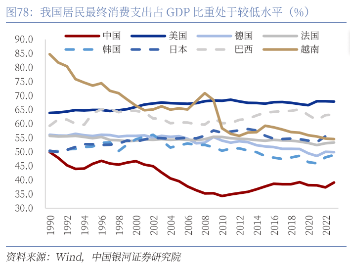 另一方面,强化消费的根本性感化,提高居平易近消费正在P中的比沉。我国消费率显著偏低,消费不脚持久存正在。国际比力来看,我国消费率不只低于发财国度,也低于同为东亚文化下的日本和韩国,以至正在某些阶段大大低于比我国人均P程度低良多的菲律宾、泰国、印度等国度。