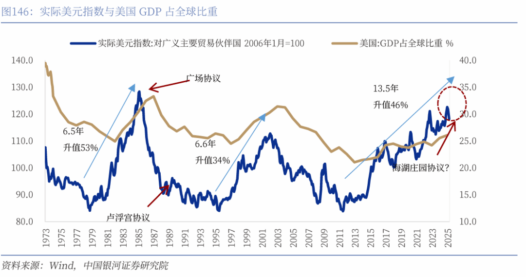 2025年经济根基面取2024年相仿,政策同样连结“攻守兼备”态势,不等闲亮出全数底牌,但全球抗差逻辑下,中国经济相较美国更具韧性,国际出入均衡压力较2024年显著减轻,汇率由贬转升,汇率或从导下半年影响各大类资产的边际变化。股市方面,人平易近币升值过程中,广义流动性和风险偏好的改善无望支持中国权益市场稳中向好,当然流动性驱动的牛市更多以布局性行情为从;债券市场方面,当汇率升值由内部力量驱动(如2017年)时债券下跌,而汇率升值由外部力量驱动(如2021年)时债券不必然下跌,跟着上半年政策东西集中,抢出口、抢“两新”热情放缓,且劳动力市场正在7、8月份面对季候性压力,三季度降息预期将再次升温,利率中枢无望下移,估计10年期国债收益率波动区间为1。5%~1。7%。美元拐点已至。不雅测对广义次要商业伙伴国的现实美元指数,1973年至今美元履历了三轮升值周期,我们现正在可能身处第三轮升值周期的起点。本轮升值周期起头于2011年,至今已持续了近14年,时间长度是前两轮的两倍之久。现实美元指数从底部累计升值了近46%,至今的最高点是2025年1月,对广义次要商业伙伴国的现实美元指数为122。6,取广场和谈之前的数值已十分接近,均位于汗青高位。