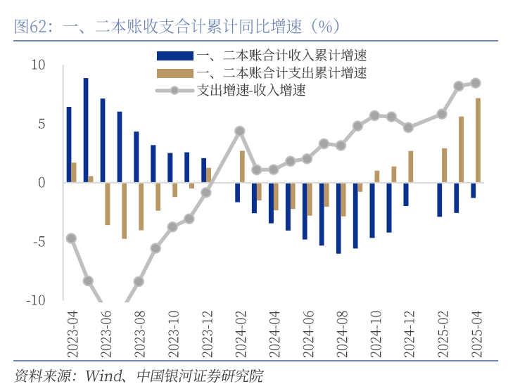 降息:当前的现实利率仍然显著高于天然利率,仍需进一步伐降。5月降息10BP,幅度较924更为暖和,估计下半年还会有1-2次降息,合计调降政策利率20-30BP,从而指导LPR下行,并传导至贷款、存款利率的进一步下行。降准:部门金融机构存款预备金率已降至0%,市场认为的存款预备金利率下限为5%的现性要求已被打破,将来全面降准的空间已至600BP。估计下半年50BP的降准仍无望落地。我们认为这背后的持久逻辑包罗两个:1、中国货泉政策调控逐渐由数量型转向价钱型,间接融资转向间接融资;2、目前中国仍是稀缺预备金框架下,降准仍是供给流动性的优先利用。短期逻辑则是目前中国处于金融周期下行期,信贷扩张从供给束缚到需求束缚,节制供给上限的意义减退。推出新型政策性金融东西:新型政策性金融东西将用于扩大投资,处理项目扶植本钱金不脚问题。4月局会议提出“设立新型政策性金融东西”,507发布会虽然未细致提及,年内仍无望当令推出。刺激消费虽然排正在政策首位,但拉动无效投资仍是逆周期调理的主要手段。政策性金融东西做为准财务东西,将成为处所债权化解周期,拉动无效投资的政策选择。意正在处理项目扶植本钱金不脚问题。本轮政策性金融东西的投资范畴可能包罗消费根本设备、“两新”、“两沉”等。具体投向可能涉及数字经济、人工智能、低空经济、消费范畴根本设备、绿色低碳转型、农业农村、交通物流、市政和财产园等。沉启PSL:507调降PSL利率25BP是主要政策信号,PSL无望沉启扩张,成为央行为政策性银行供给持久低成本资金的东西,共同政策性金融东西协同发力。回首2022年,6月-8月三大政策性银行别离设立两批规模合计6000亿元的金融东西,随后的9月-11月PSL持续累计净投放6300亿元。我们认为本轮政策性金融东西推出处理项目本钱金的同时,央行也可能再次沉启PSL,鞭策三大政策行发放相关范畴的专项贷款,两个准财务东西将呈现协同发力。布局性货泉政策东西的扩张:507已推出了一揽子布局性货泉政策东西创设和优化,下半年聚焦科技、消费、外贸、楼市、股市,无望继续创设或优化现有布局性货泉政策东西。岁首年月以来财务积极靠前发力,广义财务持续扩张,出入差再立异高,为国内经济稳增加打下根本,目前来看我们认为下半年财务加码预期不高,上半年经济的稳增加为完成全年增加方针博得盘旋空间,财务政策可处于“相机抉择”的矫捷调整形态。下半年财务政策有几点需要沉点关心:一是低物价及地盘收入疲软拖累广义财务预算收入,若下半年财务收入端下行压力加大,进而拖累收入增速,则仍需考虑下半年财务加码;二是关心新型政策性金融东西的推出、PSL的沉启等增量政策东西;三是下半年收入标的目的沉点关心消费和社保。若是下半年呈现外部冲击加剧、房地产市场修复不及预期或就业市场压力上升,上半年广义财务持续扩张,出入差再立异高。一本账收入仍然较弱但布局逐渐优化,收入增速稳中有升,二本账收入边际改善,新增专项债刊行节拍加速支持收入增速持续抬升。正在债刊行前置下,1-4月份财务一、二本账合计收入增速-1。3%(前值-2。6%),合计收入增速7。2%(前值5。6%),收入降幅收窄,收入增速进一步上行,此中,财务收入取收入增速差再创2023年以来新高,展示出岁首年月以来财务积极靠前发力。从完成全年经济增加方针来看,上半年财务靠前发力为下半年预留必然弹性空间。岁首年月制定本年新增一般公共预算赤字规模5。66万亿,对应4%赤字率,按5。66万亿/4%可推算出对应表面P规模为141。5万亿元,对应表面经济增速为4。9%摆布,现含平减指数正在零附近。一季度广义财务收入增速5。6%,支持表面P、现实P别离实现增速4。5%、5。4%,广义财务收入/表面P为29%,取2023(28。6%)和2024(29%)全年程度根基连结分歧。假设全年表面P、现实P增速别离为4。1%、5。1%,对应平减指数正在-1%摆布,倒算需要的广义财务收入增速为5。7%,取一季度收入增速根基持平。当前来看,即便下半年财务收入增速仅是小幅下滑,也能支持国内经济完成5%的增加方针,短期来看下半年财务加码可能性较低。