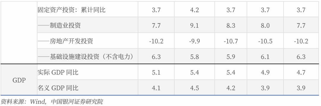 2025年下半年经济面对的不确定性仍然较大,全球政策经济多变,客不雅上也使得国内经济增加的波动区间放大,因而正在上述基给假设情景的根本上,我们也设置了以下乐不雅环境和悲不雅环境,现实P增速范畴为4。8%~5。2%。乐不雅环境:现实经济增速5。2%、表面经济增速4。8%。乐不雅情景的主要前提假设是出口连结韧性,制制业处于高位,消费持续回升。全球层面经济仍然连结增速,即便关税仍然存正在,中国出口仍然连结韧性,出口增速处于高位。政策层面愈加沉视“稳增加”,预算赤字率和本钱性债权规模添加,对应社融增速达到9。0%。内需方面,消费持续上行和基建行业的回升,拉动CPI回升、PPI降幅削弱。外需方面,全球经济平稳,关税政策对出口的冲击可控,出口对经济拉动感化继续连结高位。乐不雅预期下主要的数据变化是:社会零售消费上行至5。5%,基建增速大幅提拔至7。9%,出口增速3。6%。悲不雅环境:现实经济增速4。8%、表面经济增速3。7%。悲不雅情景下中美商业不再缓和,美国经济同样呈现回落,我国出口增速呈现较大幅度下滑,进而对国内工业出产构成拖累感化。内需方面,政策力度连结不变,对消费和社保范畴的支撑政策落地较慢,房地产下行速度加速,对持续回升中的消费发生二次冲击,物价持续走低带动表面经济增速降低。投资方面,预期进一步走弱,企业信贷和投资需求降低。悲不雅预期下主要的数据变化是:出口增速大幅回落至-5。7%,消费增速正在4。0%摆布,CPI降至-0。2%,PPI持续降至-2。7%。自2023年以来工业出产就做为我国“经济压舱石”,持续托底我国经济。2025年前五个月,虽然特朗普上台大幅扰动全球经济,但我国工业经济仍连结了极大的韧性,1-5月工业添加值累计增加6。3%,高于客岁同期的6。2%。正在关税、“两新”补助以及国产人工智能迸发的三堆叠加下,工业添加值呈现出了“三抢”态势(抢出口、抢“两新”和抢AI)。我们认为,下半年跟着出口增速的降温,“两新”政策的边际递减和“反内卷”等新供给侧的推进,估计工业添加值将逐渐降温,全年增速为5。3%。此中,二、三和四时度同比增速别离为5。0%、5。0%和4。7%。