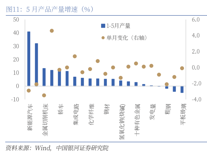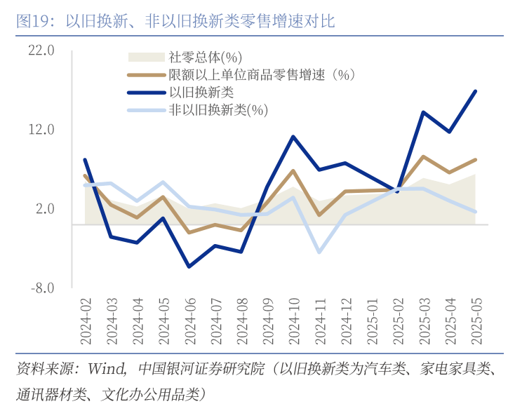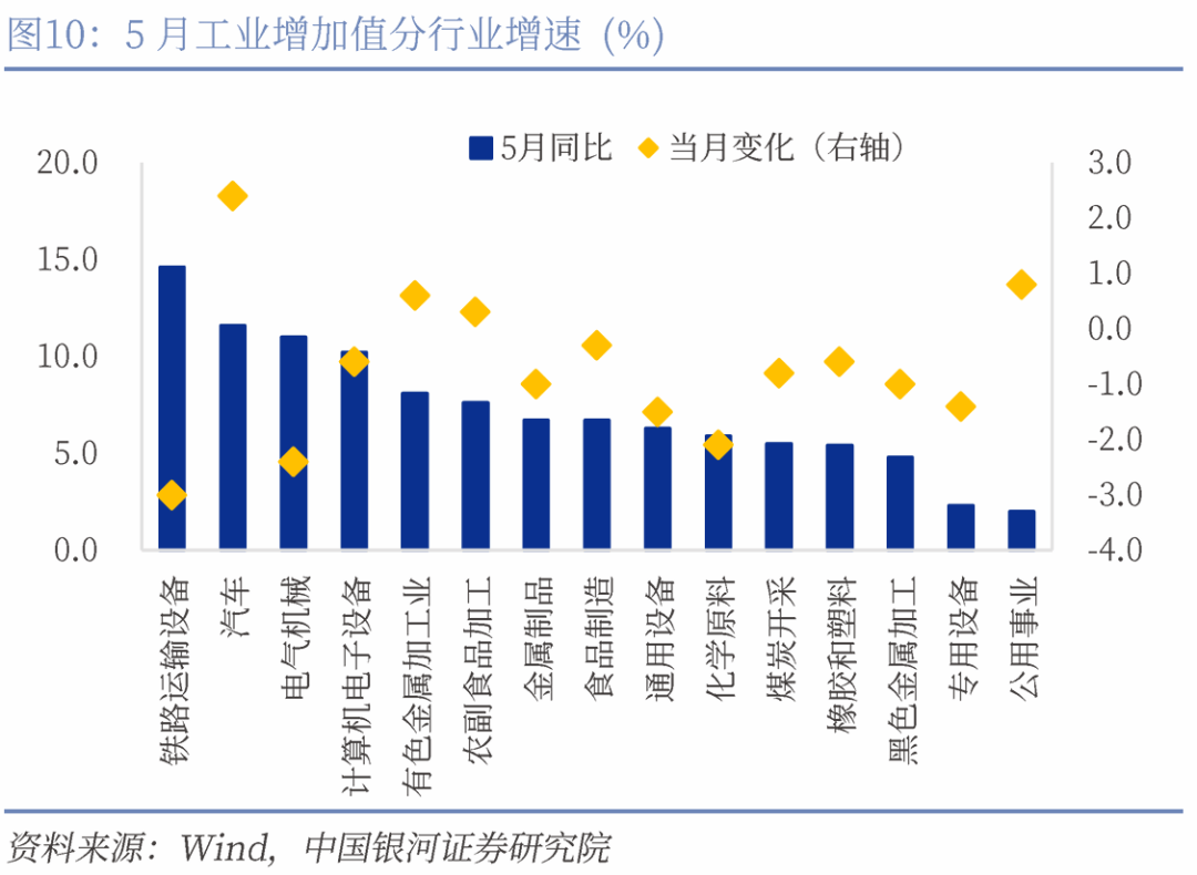 “三抢”带动上半年工业出产。2025前5个月,工业添加值当月同比增速别离为5。9%(1-2月)、7。7%、6。1%和5。8%。能够较着看出特朗普颁布发表对等关税正在4月2日发布后间接推高了外需订单和出产的迫切性。内需方面,因为客岁4个月就用完了3000亿的“两新”资金,本年“两新”的财务支撑力度能否充脚?将来政策能否有延续性?取其猜这些问题的谜底,厂商选择不如靠前发力,抢“两新”额度,进一步形成了出产前置。5月份,正在设备更新政策等要素带动下,电机制制、船舶及相关安拆制制、汽锅及原动设备制制等行业添加值同比别离增加23。3%、12。8%、11。8%;金属轧制设备、气体分手及液化设备、包拆公用设备、锻制机械等产物产量别离增加34。3%、33。6%、29。0%、26。7%。以旧换新方面,正在汽车报废置换更新补助政策等带动下,汽车产量增加11。3%,取之相关的充电桩产量增加26。0%;得益于消费品以旧换新及购新补助政策支撑,平板电脑、电动自行车、5G智妙手机等产物实现较快增加,增速别离为30。9%、20。5%、13。4%。最初,Deepseek的横空出生避世让国产AI燃起高潮,对人工智能相关设备和产物的需求也送来了迸发,因而“三抢”配合鞭策工业添加值正在上半年的高增。从行业上能够看出,增加前四位的铁船舶航空航天运输设备、电气机械、计较机电子以及汽车制制业均包含出口、“两新”和AI属性。5月正在大模子快速成长带动下,办事器产量增加2。2倍,3D打印设备、工业机械人、办事机械人等智能化产物产量别离增加40。0%、35。5%、13。8%。