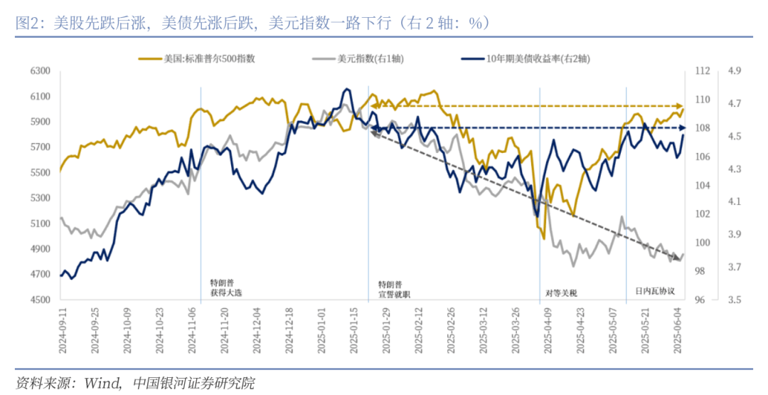 然而,美元已陷入“特里芬两难”窘境之中,特朗普朝四暮三的政策似乎只是加剧了市场的波动,并未改变“东稳西降”的根基叙事。面临庞大的债权压力,特朗普正在强化财务规律的同时,却又试图大幅提高债权上限,雄心壮志地鞭策,最终却被冠以“TACO”(Trump Always Chickens Out, “特定”)的称号。马斯克从D OGE中激流怯退,能够视做美国体系体例的纠偏,也能够视做一个家面临深层的力有未逮。从市场表示来看,特朗普获胜以来,美股先跌后涨,美债先涨后跌,截至6月初,标普指数和10年期美债收益率都回到了“最后的起点”,只要美元指数呈现枯燥下行走势。