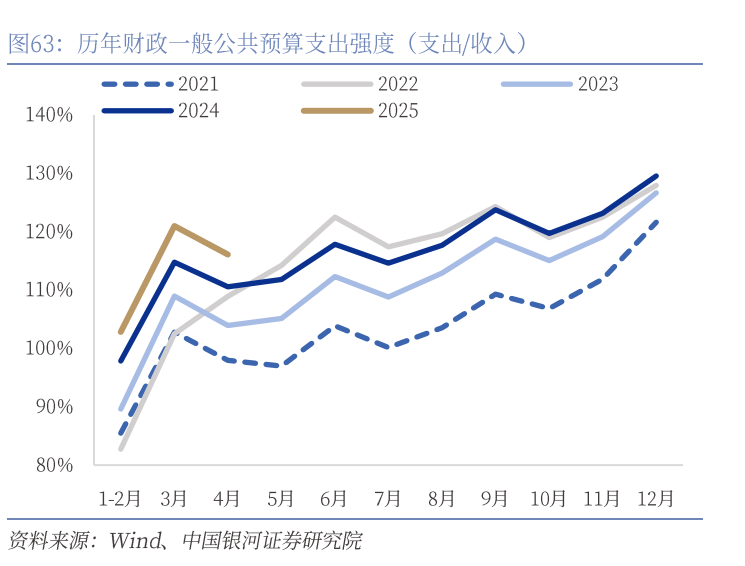 低物价或拖累税收进度完成。岁首年月预算草案制定的税收规模为18。15万亿,增速方针为3。7%,目前1-4月累计增速为-2。1%。参照岁首年月预算草案制定的税收完成打算,收入完成进度为36。1%,高于客岁同期的35。7%但低于过去五年均值程度的36。7%。受益于客岁低基数效应,4月税收收入当月同比转正回升至1。9%(前值-2。2%),税收完成进度无望逐渐改善,但考虑到下半年物价继续承压,可否完成全年3。7%的预算增速仍需察看。地盘收入不及预期可能导致二本账收入缺口达3500亿摆布。4月份房地产开辟投资完成额累计同比下降10。3%(前值-9。9%),虽然4月当月卖地收入增速转正,但可持续性仍有待察看,从高频数据来看,岁首年月以来地盘成交总价持续位于低位区间。本年预算草案对于性基金预算收入增速为0。7%,目前1-4月累计增速为-6。7%,收入完成进度为20。1%,高于客岁同期的19%,受制于地盘收入岁首年月以来的持续疲软,假设全年增速正在-5%摆布,则对应3513亿减收规模。