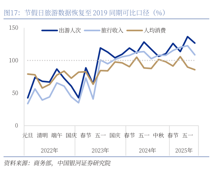 中国消费市场正正在履历布局性跃迁,呈现“物质消费化,消费豪侈化”的新常态。一方面,过去持续几年经济的不确定性促使人们从头审视消费价值,保守消费呈现“化”特征。本年假期出行持续火热,但人均消费收入连结不变以至呈现小幅下降趋向,以端午假期为例,本年端午假期出逛人次较2019年同期增加26。6%,出逛收入增加8。6%,人均消费收入仅为2019年同期85。6%的程度,申明消费者正在更沉旅逛、文娱等“体验型”办事消费的同时,收入也愈加。连系当前保守消费品范畴呈现价钱度提拔、中低端产物销量增加等愈加逃求质价比的消费行为特征,我们认为保守消费呈现“化”特征。另一面,取此同时新消费品牌兴起,老铺黄金、泡泡玛特持续火爆。“消费化”取“新消费兴起”并存实为消费市场沉构的一体两面,素质是消费由“物质满脚”向“满脚”的跃迁,构成“物质消费化,消费豪侈化”的二元布局,旅逛、文娱、体育勾当等体验类、情感类“悦己消费”的需求显著添加。二季度正在政策结果及低基数效应下实现较高增速,估计三季度消费平稳增加,四时度跟着基数支持感化下滑和政策拉动感化削弱面对必然下行压力。对应到社零数据上,保守消费的化或使得消费内活泼能偏弱,消费者决心和消费倾向曾经趋于不变,进入新的“稳态”,而向上的拉动力量次要有二:一是政策驱动的以旧换新范畴(家电、通信器材、文化办公用品等)耐用品的升级需求,二是消费豪侈化驱动的体育文娱用品和金银珠宝类消费。郑州于6月7日启动黄金珠宝消费补助,初次将贵金属纳入补助,将来若能推广至更多省市以至全国范畴,或进一步激发该品类消费动能。