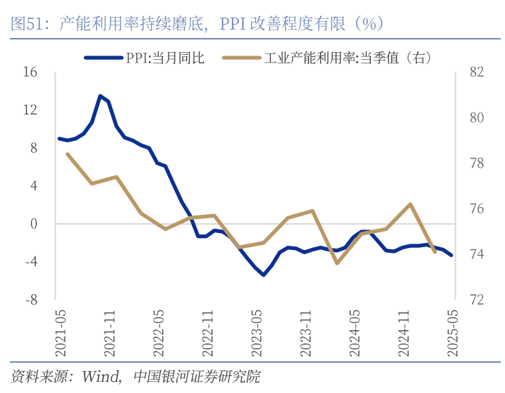 PPI方面,年内改善程度或无限,PPI同比无法转正,估计全年PPI同比-2。3%,二、三、四时度增速别离为-3。1%、-2。5%和-1。4%。一是房地产市场尚未企稳,处所地盘收入低于预期导致基建投资不及预期。房地产市场持续下行、基建投资增速偏缓、导致工业品需求持续下行,地产疲软拖累上逛开工历程,需要关心下一步增量政策的出台。前五个月房地产开辟投资完成额累计同比下降10。7%(前值-10。3%),我们估算当月投资增速为-11。98%(前值-11。3%)。我们认为投资端的走弱次要来自于,一方面从保交楼政策来看,存量待施工项目逐渐削减,完工面积本月累计增速-17。3%(前值-16。9%),而另一方面正在“严控存量、优化增量”要求下,新开工面积修复较慢(本月-22。8%,前值-23。8%),继而带动全体施工面积降低。1-5月施工面堆集计增速-9。2%(前值-9。7%),较上月进一步降低。同时百城地盘成交面积本月下降8。3%。目前来看,房地产开辟投资增速的修复需要关心下一步增量政策的出台。6月14日总理掌管国常会时,提出要建立房地产成长新模式,更鼎力度鞭策房地产市场止跌回稳。二是微不雅经济从体动能不脚,企业投资及居平易近消费志愿偏弱。本年以来M1增速小幅回升但仍正在低位,5月M1同比增速上行至2。3%(前值1。5%),过去五年M1同比增速均值为4%。BCI企业利润前瞻指数自2月份以来也呈现持续下滑态势,5月比2月下行4。67个百分点至46。63;其次下逛居平易近消费决心偏低带来全体消费低迷,4月消费者决心指数为87。8,人们对就业的决心和收入的预期同样偏弱,带动M1下行;别的部门上逛企业累库、企业采购志愿降低,仅刚需采购,亦难以带动内需提振。当前形势来看,企业投资需乞降居平易近消费志愿偏弱,难以对PPI上行带来无力支持。三是制制业产能操纵率持续磨底,PPI改善程度无限。从沉点行业的产能操纵率来看,当前工业仍存正在必然的闲置产能。本年一季度,我国工业产能操纵率为74。1%,同比环比均呈现下降趋向,需求仍弱。相对于需求不脚的下逛终端,中逛制制业的过剩产能晦气于价钱从上逛向下逛的传导。下逛需求的走弱导致PPI维持低迷,同时拖累了中上逛企业的盈利能力,进一步障碍了企业部分的偿债能力,正在企业部分面对去杠杆的压力下,信贷扩张将难以实现,从而构成了所谓价钱下跌的逆向轮回。