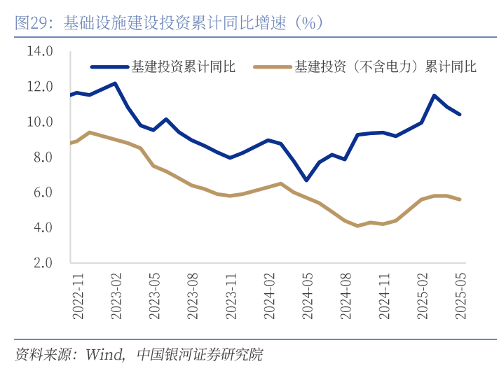 估计2025年全年基建投资(不含电力)累计同比增速为6。3%。1-5月份基建投资累计增速为5。6%,基建投资增速连结不变,从基建投资分类增速来看,由地方从导的铁运输业投资累计同比增速2。3%,较客岁中枢程度大幅回落,而水利投资自客岁下半年来增速中枢持续抬升,处于30%以上的高位。而大部门由处所从导的道运输投资和公共设备投资累计增速别离为-0。4%、3。8%,上半年地方从导的项目扶植成为基建投资主要支持。本年1-5月份的基建投资完成额正在客岁一、二季度6。5%、5。4%的较高基数根本之上仍然维持了6%摆布的增速,次要支持来自于国债和专项债刊行前置。瞻望下半年,超持久出格国债方才启动刊行,处所新增专项债亦有3万亿元摆布待发规模,按照4月局会议加速落实存量政策的全体要求,估计二季度基建投资仍将连结不变增加,全年增速应高于经济增速,四个季度狭义基建增速别离为5。8%、5。9%、6。1%、6。3%。“两沉”共同超持久国债,地方从导的基建无望连结不变增加。目前来看,本年1。3万亿的超持久出格国债中,8000亿优先投向“两沉”,沉视软硬连系,“硬投资”也就是项目扶植方面,本年已放置近5000亿元,支撑沿长江交通根本设备、农业转移生齿市平易近化、高尺度农田扶植、城市地下管网、“三北”工程等一批严沉项目扶植。“软扶植”也就是为保障项目实施而推进的轨制扶植方面,推进构成项目扶植实施和运营的长效机制,提高投入效率。5月20日,正在发改委召开的旧事发布会上提到,力争6月底前下达完毕本年全数“两沉”扶植项目清单。2025年做为“十四五”收官之年,“两沉”扶植完成环境备受注目,估计地方从导的严沉根本设备扶植投资规模无望连结不变增加。