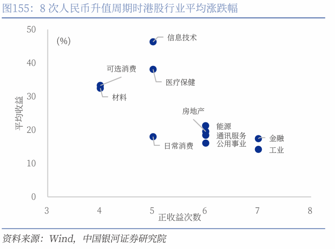 从汗青上看,当人平易近币兑美元升值时,中国股市往往表示优良,港股比A股的涨幅更大。颠末测算,2012年以来,人平易近币兑美元共计8个升值周期,此中A股、港股各有6个周期录得正收益,期间人平易近币兑美元升值每1%,A股平均上涨2。94%,而港股上涨3。68%。
