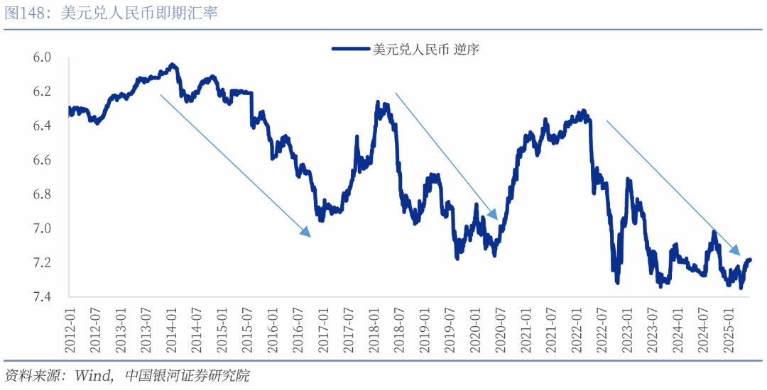 人平易近币将稳健升值。我们估计美元兑人平易近币汇率将正在年内稳健下行,岁尾无望接近7。0附近。我们认为驱动听平易近币升值次要有两个要素:经济根基面和国际本钱流入。货泉政策将从中性要素逐渐过渡到积极要素,商业顺差的收窄则可能是负面要素。央行的汇率政策仍然是连结人平易近币汇率的根基不变,这意味着升值的程序将连结很是稳健。察看数据发觉,人平易近币过去呈现“慢贬快升”的款式,即凡是长达三年的贬值周期之后会送来一个一年摆布的升值周期,现正在我们可能正坐正在本轮升值周期的起点。