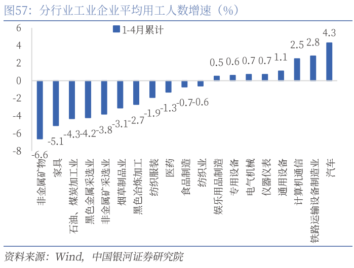 新质出产力相关行业接收就业能力较强,上逛原材料以及消费制制业用工人数遍及下降。2025年1-4月,配备制制业的用工人数遍及有所增加,汽车制制业、铁运输设备和计较机电子用工人数别离增加4。3%、2。8%和2。5%,通用设备和公用设备就业人数也有正增。而纺织业、纺织服拆、食物制制以及医药制制业就业人数均同比下降,上逛原材料采选和加工业用工需求下滑较为显著。次要缘由有:一是出口的不确定性这些行业用工需求,二是内需的不不变也晦气于消费制制业扩张用工需求,三是企业利润的萎靡企业收缩规模,数据上看工业企业用工人数和工业企业企业利润之间关系较大。